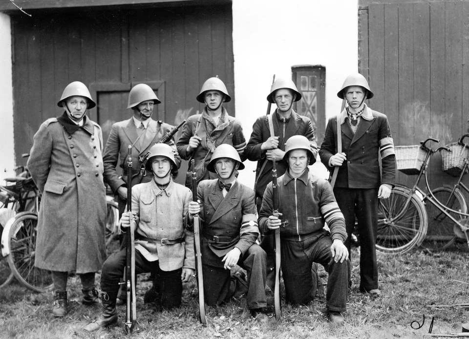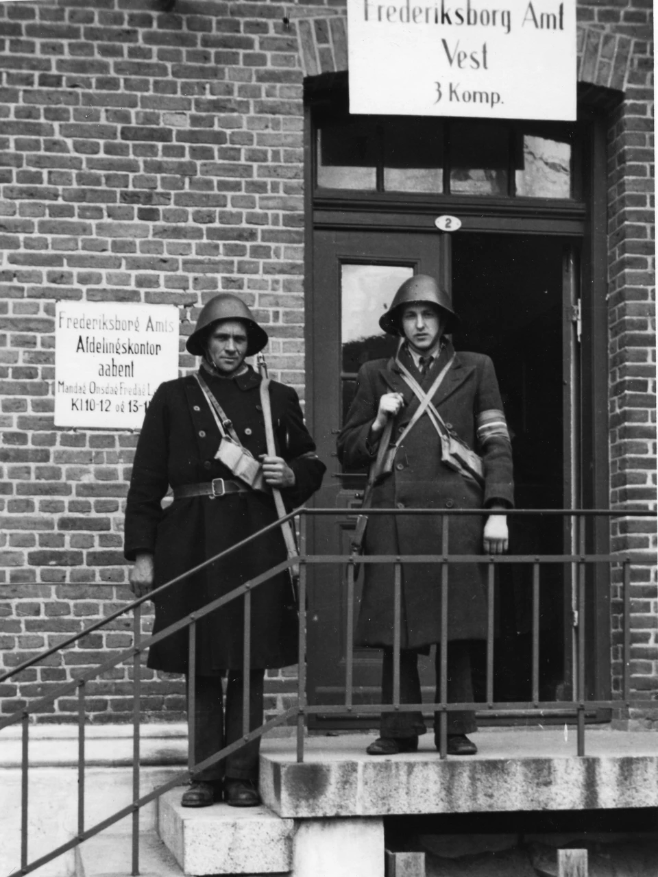 Frihedskæmpere holder vagt foran Tinghuset i Helsinge, 1945