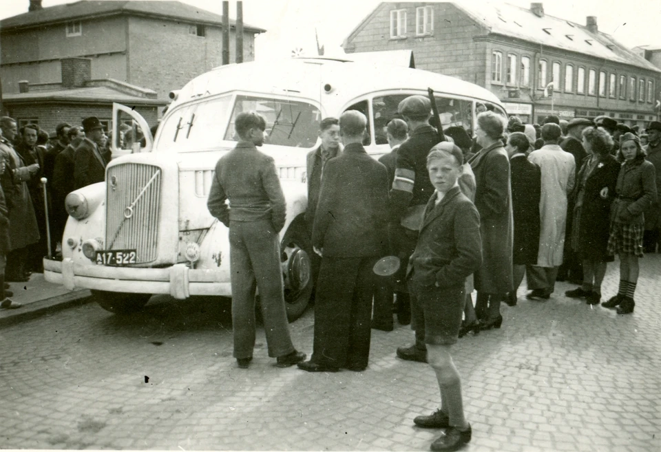 En af De Hvide Busser holder i Østergade, Helsinge, 6. maj 1945