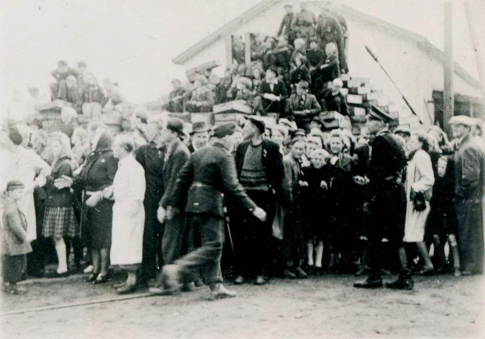 Tilskuere og politi ved det midlertidige fængsel ved gødningslageret på Gilleleje Havn, 1945.