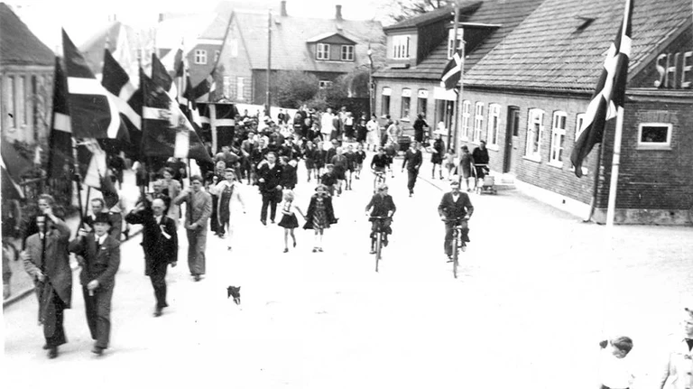 May 8th became known as VE Day (Victory in Europe). In Helsinge, the day was celebrated with a parade where freedom fighters from Helsinge and surrounding towns marched through the streets. The parade started from the sports field at the end of Idrætsvej and ended in Præstegårdshaven, where tables and benches were set up.