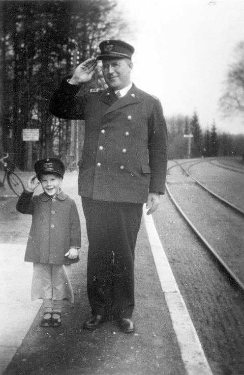 Stationsforstander Kristian Kristensen står på perronen ved Kagerup Station sammen med sin søn Hans-Kristian, ca. 1935. Foto: Gribskov Arkiv, ukendt fotograf.