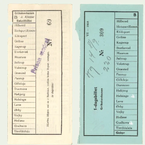 Til venstre: Enkeltbillet fra 1940 til en rejse på 3. klasse mellem Hillerød og Kildeport. Billetten er solgt seks år efter afskaffelsen af 3. klasse. Oplaget skulle bruges op! Til højre: 1-dagsbillet fra 1958 til en returrejse mellem Helsinge og Godhavn. Foto: Dansk Jernbane-Klubs arkiv.